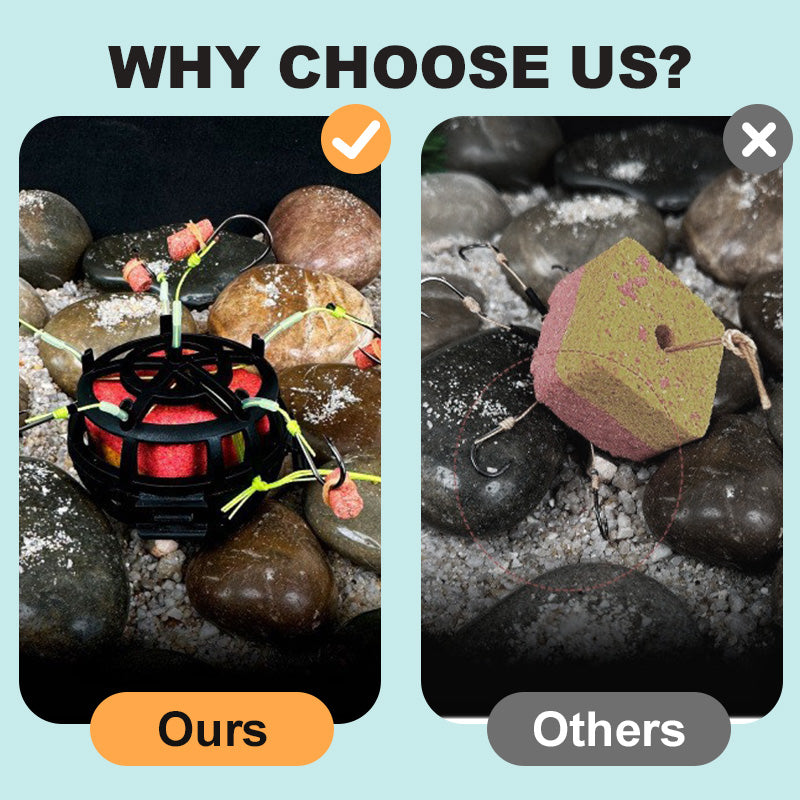 SYSTÈME D’APPÂT TOUT-EN-UN – Combine 6 hameçons aiguisés avec une large cage à appât pour attirer les poissons plus rapidement. Remplissez-la avec des cubes, granulés ou appât en poudre — elle diffuse des traînées olfactives irrésistibles qui déclenchent l’alimentation des poissons.