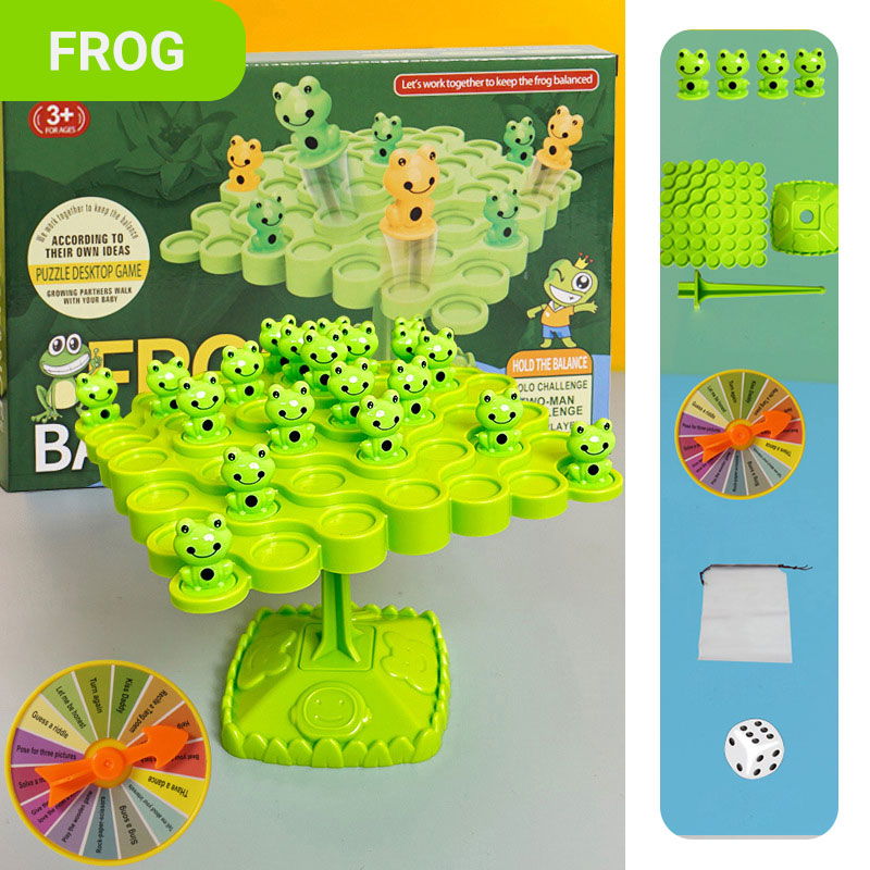 RÈGLES DU JEU - Premier jeu : 2 ou 4 joueurs placent tour à tour des grenouilles sur la balance. Si un côté perd l'équilibre, c'est perdu. Deuxième jeu : Les joueurs placent une grenouille sur une position déterminée en fonction du résultat du dé, ajoutant une touche d’imprévisibilité. Troisième jeu : En tournant la grande roue d’aventure, le perdant subit une petite "punition". Ces règles permettent d’explorer plusieurs jeux amusants et de passer des moments palpitants en famille ou entre amis. Devenez le roi des jeux lors de vos soirées !