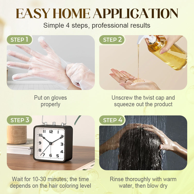 TEINTURE FACILE À LA MAISON - Transformez votre expérience de coloration avec un processus d'application incroyablement simple. Aucun mélange requis ; appliquez directement. En seulement quatre étapes faciles, obtenez des résultats d'apparence professionnelle dans le confort de votre maison, en économisant temps et argent tout en maîtrisant votre routine capillaire.