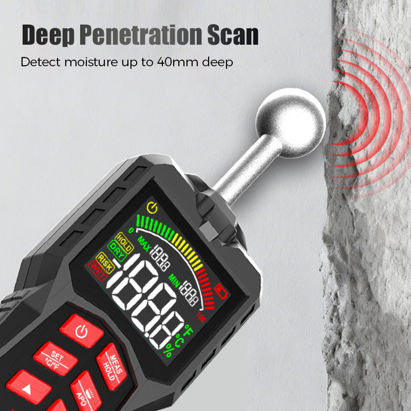 DEEP PENETRATION MEASUREMENT - Detect moisture up to 40mm (1.6 inches) deep within various materials. This powerful feature allows you to identify underlying problems in drywall, wood, and concrete that are invisible on the surface.