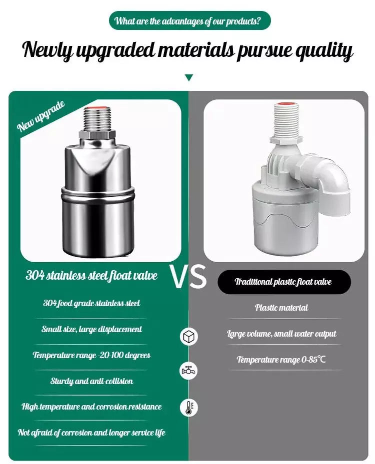 La vanne à flotteur de contrôle du niveau d'eau en acier inoxydable 304 entièrement automatique est fabriquée en acier inoxydable 304 de qualité alimentaire, garantissant la sécurité de l'eau potable. Avec une apparence exquise et une coque dure durable, il a une forte résistance au frottement et aux chocs, augmentant efficacement la durée de vie du produit et faisant du frottement un problème dans la vie.
