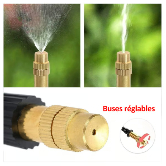 La buse de pulvérisation améliorée est équipée d'un bouton. Plus le bouton est serré, plus la brume d'eau est dispersée. Qu'il s'agisse d'une fine brume pour protéger les semis ou d'un arrosage efficace de la pelouse, le réglage par simple pression d'un bouton répond à vos besoins et vous aide à réduire considérablement le gaspillage d'eau.